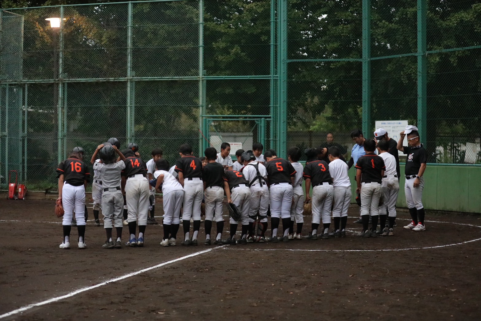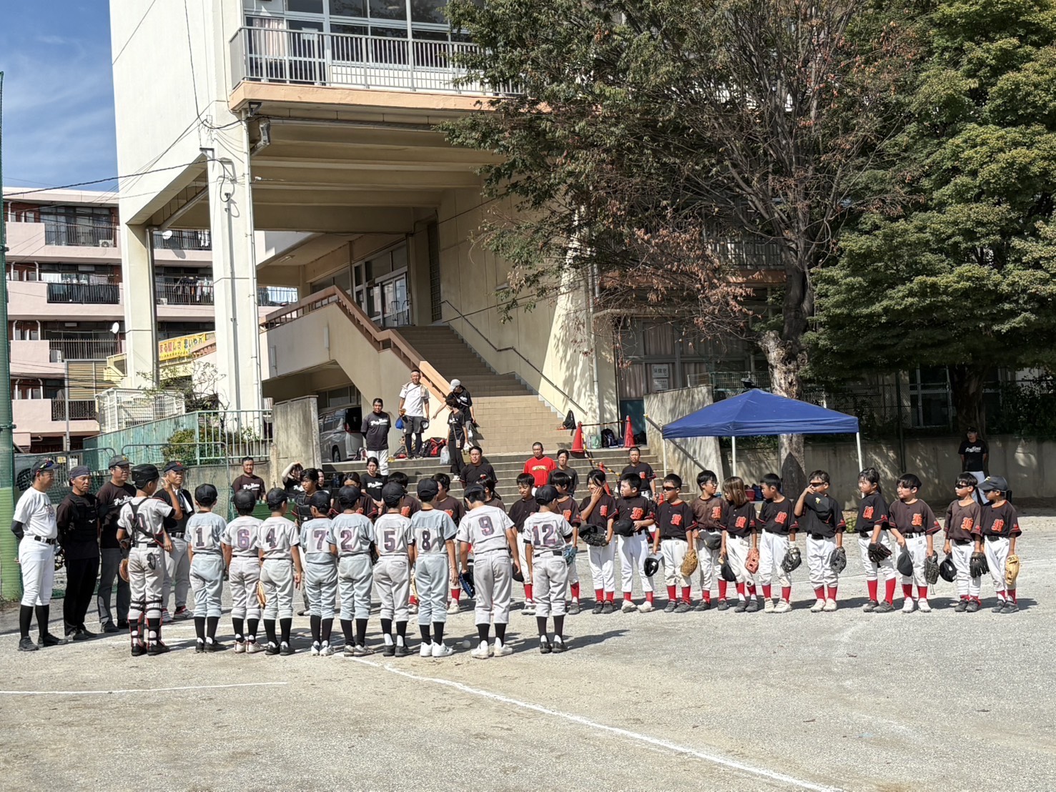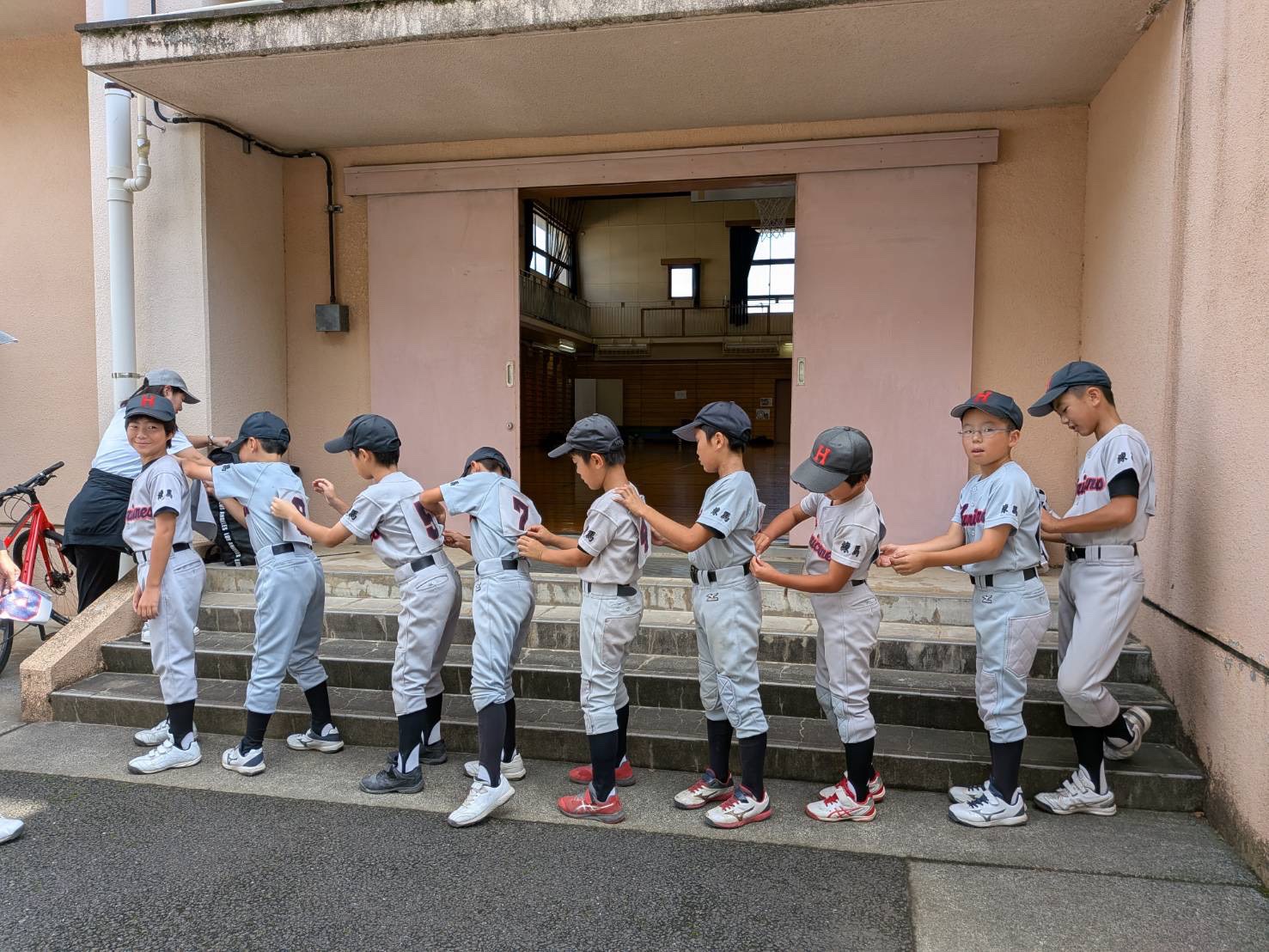 新人戦の背番号を貰って背中に付けている図(ムカデ競争ではありません)